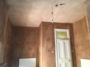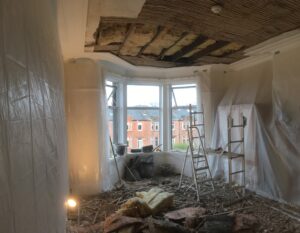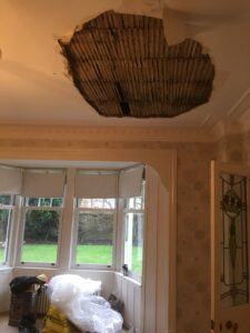 Depending on the size of the damaged area, this can be filled with a bonding material back onto the original laths, or if a much larger area, plaster-boarded and then skimmed over to the required level ready for decorating.